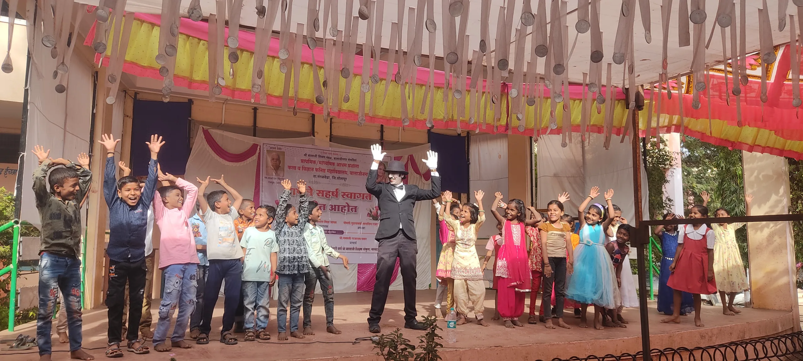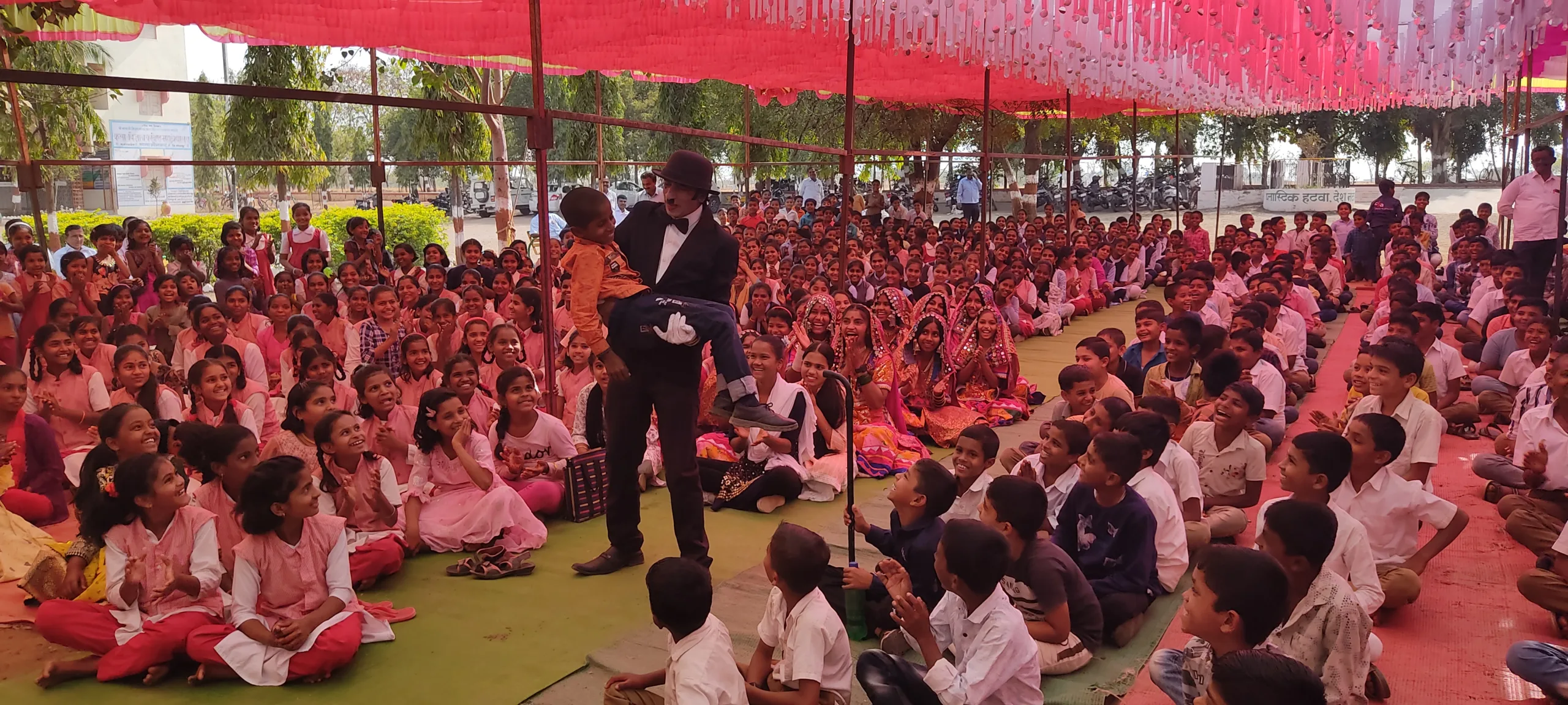 कला व शिक्षण कधीही वाया जात नाही असे नमुद करून चार्लीन चॅप्लिन फेम अंबादास कनकट्टी यांनी सुरवातीस विद्यार्थी वर्गातून प्रवेश करीत जीना इसीका नाम हैं या गाण्याच्या तालावर विद्यार्थी, मान्यवर यांची भेट घेत त्यांना आपलेसे केले. सकाळच्या प्रहारी होणारे विविध पक्षांचे आवाज काढत विद्यार्थ्यांना आनंदाच्या दुनियेत घेऊन गेले. चार्ली चॅप्लिन ची भूमिका साकारत त्यांनी विद्यार्थी व उपस्थित मान्यवरांना मनमुराद हसवले. फोनवरील संभाषण, तीन पॅक घेतलेला दारुडा, टांगेवाल्याचा घोडा, रेल्वेस्टेशन वरील विविध विक्रेत्यांचे आवाज, प्रवाशांचे आवाज, रेल्वेचा आवाज, लहान मुलांचां आवाज असे विविध आवाज सादर करून साऱ्यांच्याच टाळ्या मिळविल्या. तर शेवटी विद्यार्थ्यासमवेत बम बमं बोले या हिंदी गाण्यावर नृत्य सादर करत कार्यक्रमाची सांगता केली.